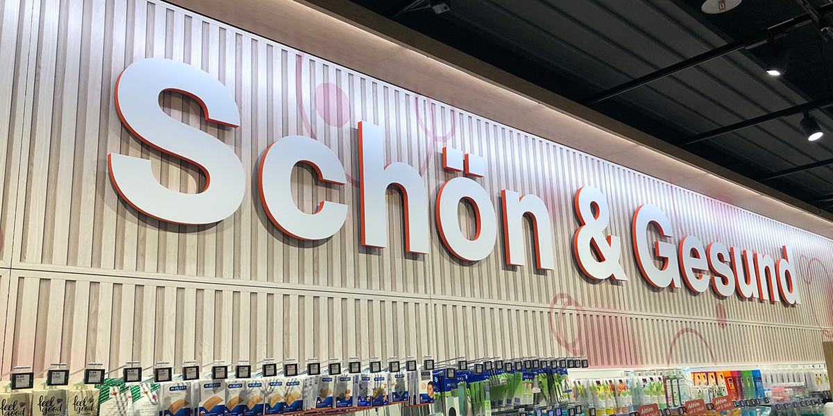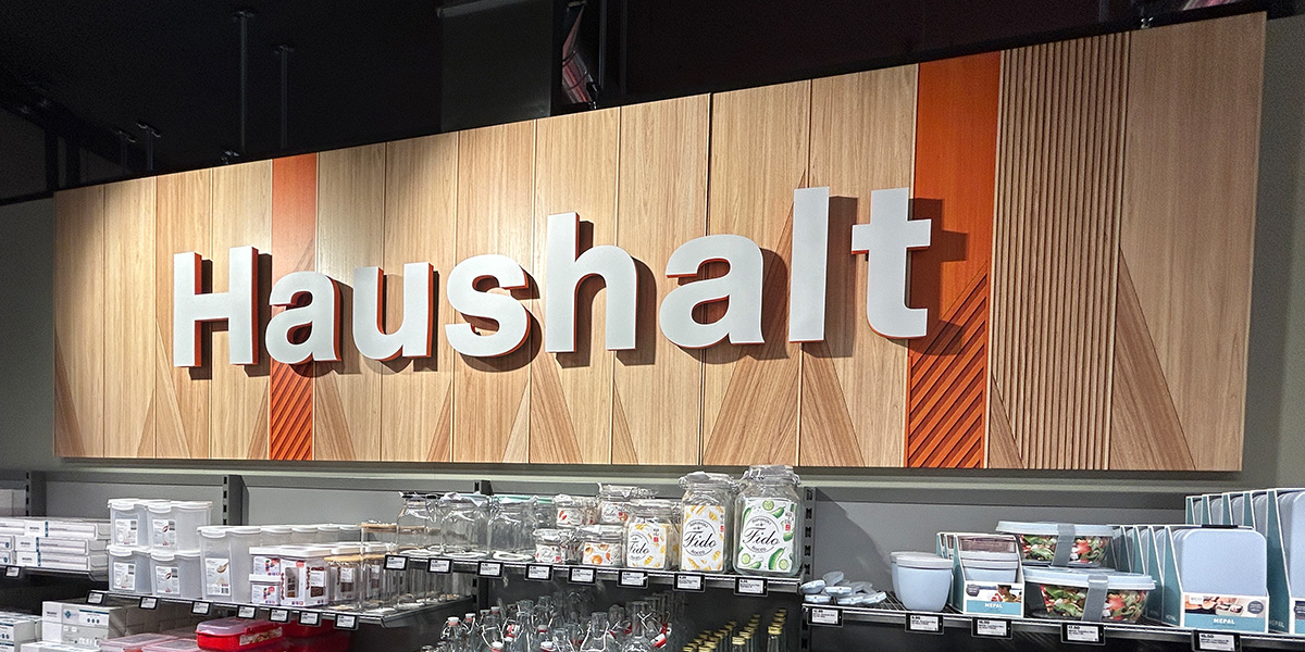 Die auffallende 3D-Beschriftung dient zur Grundorientierung in den Geschäften. Die 3D Buchstaben fertigen wir aus orangem PUR und versehen sie mit einer weissen Abdeckung. Befestigt werden die Buchstaben auf einer bedruckten Kartonwabe mit Holzoptik. Damit sich die verschiedenen Bereiche im Aussehen unterscheiden, kommen sie in spezifischen Mustern und unterschiedlichen Farben daher.