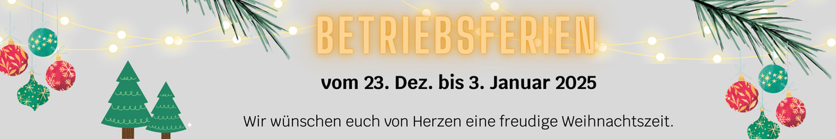 Vom 23. Dezember 2024 bis 3. Januar 2025 geniessen auch wir die Festtage zu Hause und sind ab dem 6. Januar 2025 voller Elan wieder für euch da.