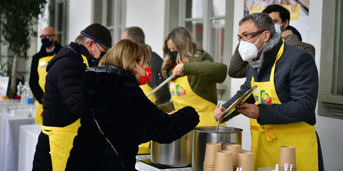 Mit der gemeinnützigen Stiftung Schweizer Tafel arbeiten wir seit über 20 Jahren zusammen. Wir sponsern Jahr für Jahr eine Werbeblache für die nationale Spendeaktion „Suppentag“ am Standort Luzern. Der Tauschhandel Werbeblache gegen Schoggikuchen entstand durch den saloppen Spruch von Silvan Rohner: „Wir drucken euch gerne eine Werbeblache. Mehr als einen Schoggikuchen braucht ihr uns dafür nicht zu geben.“ So wurde der Kuchen fester Bestandteil des Sponsoring-Deals. Ganz zur Freude von Silvan und des gesamten naschfreudigen ComRo Teams.